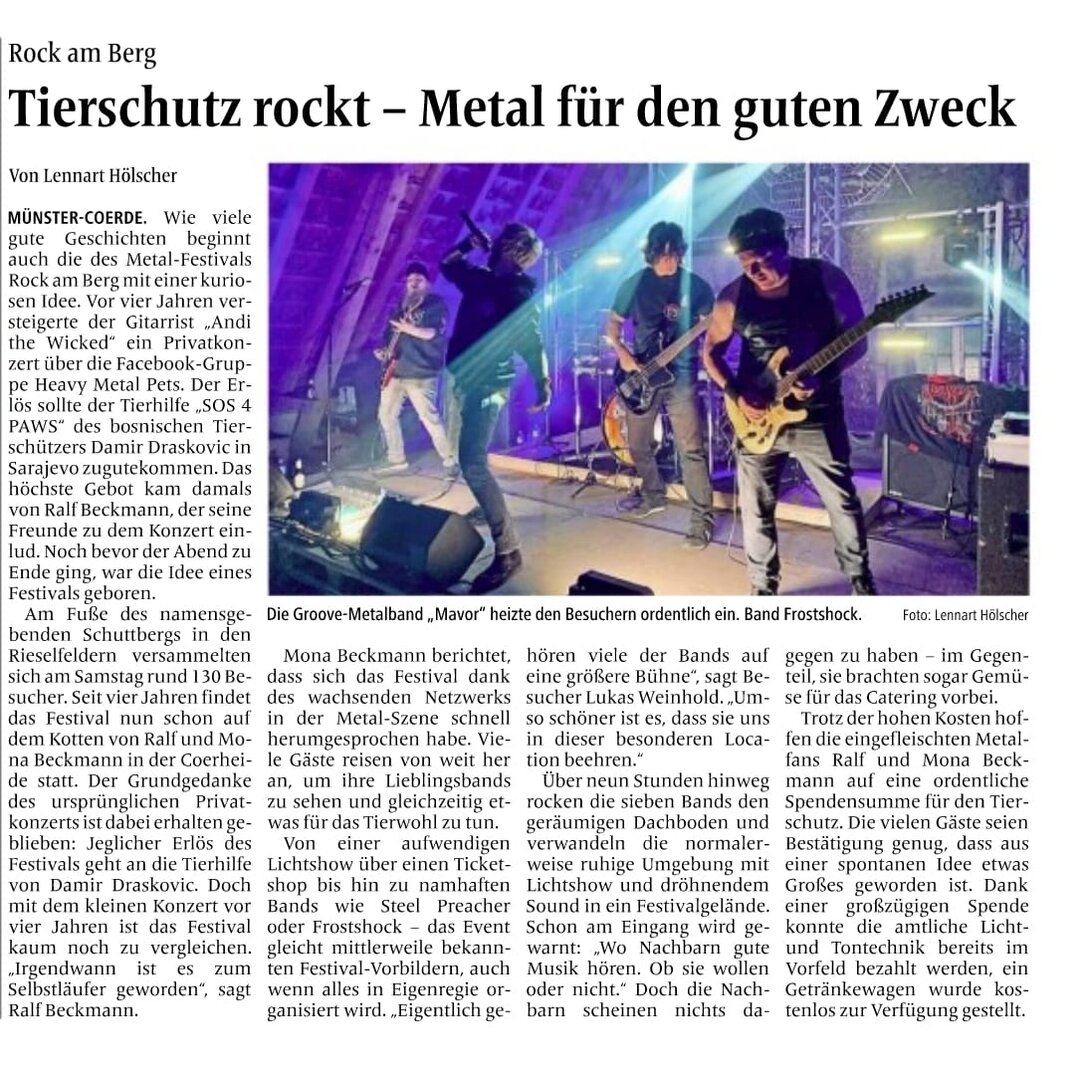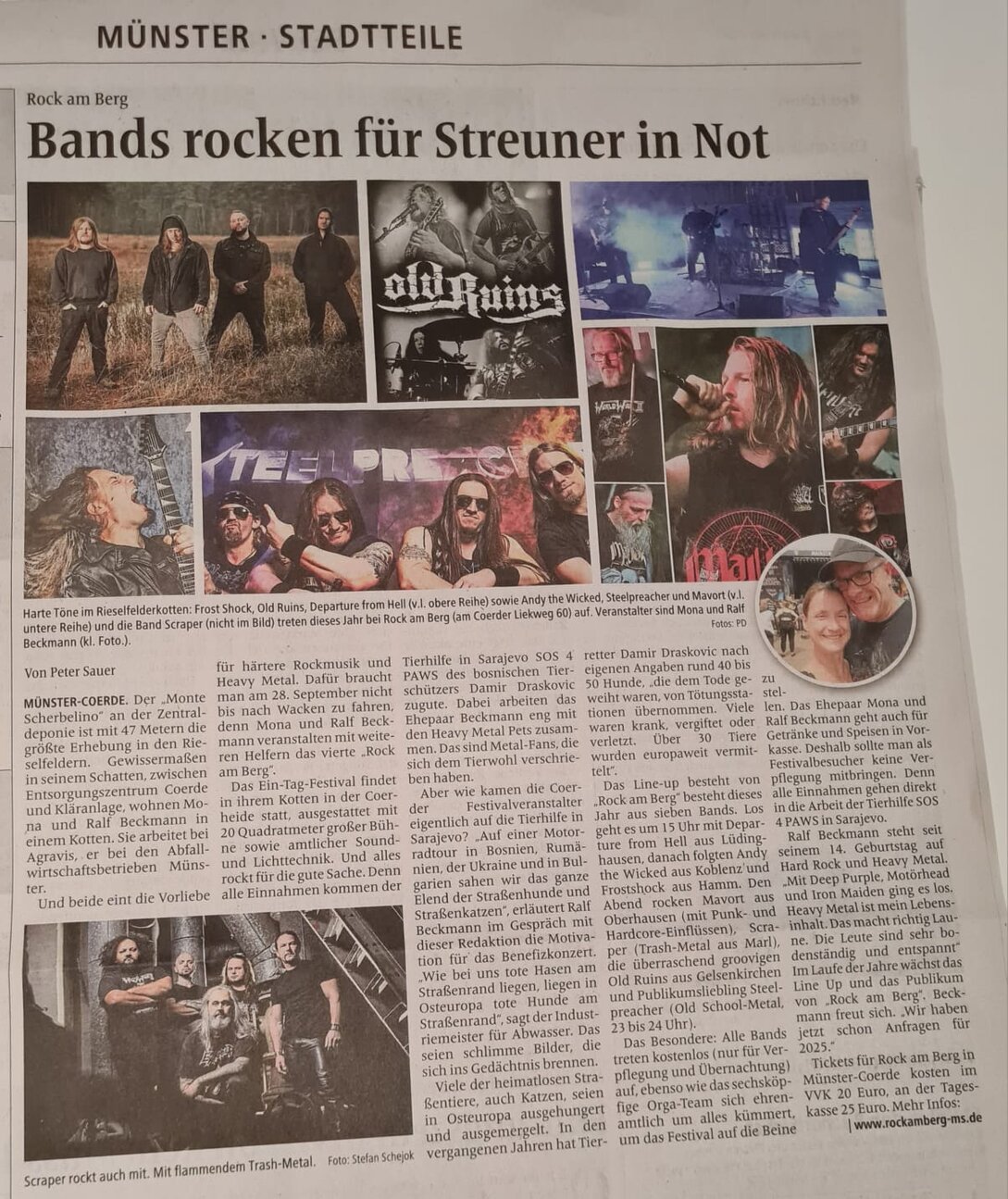 Am 19.09.2026 findet zum sechsten Mal das „Rock am Berg“-Festival in Münster statt. Alle auftretenden Bands spielen ohne Gage. Das Festival dient dem Zweck, Spenden für die Obdachlosenhilfe in Münster und Straßenhunde und -katzen in Sarajevo zu generieren, wo Damir Draskovic mit seiner Tierhilfe SOS 4 Paws seit vielen Jahren als Tierschützer aktiv ist. Dabei arbeiten wir eng mit den Heavy Metal Pets zusammen. Wir erzielen keinen Gewinn. Alle Beteiligten und Helfer bringen sich mit ihrem Engagement ehrenamtlich ein, danke dafür im Voraus.